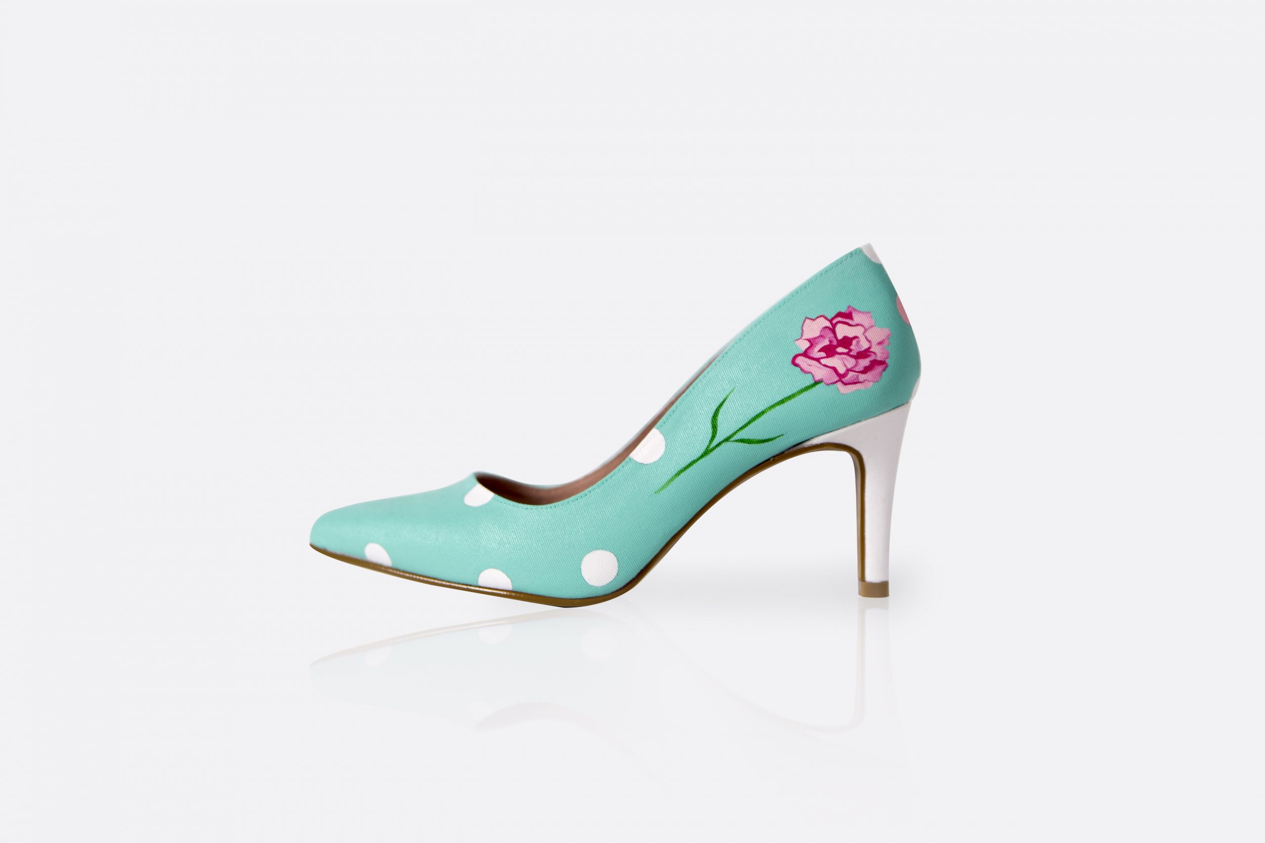 Stiletto sobre una tonalidad marina, verde turquesa con lunares blancos y rosas, y una flor  pintada rosa.